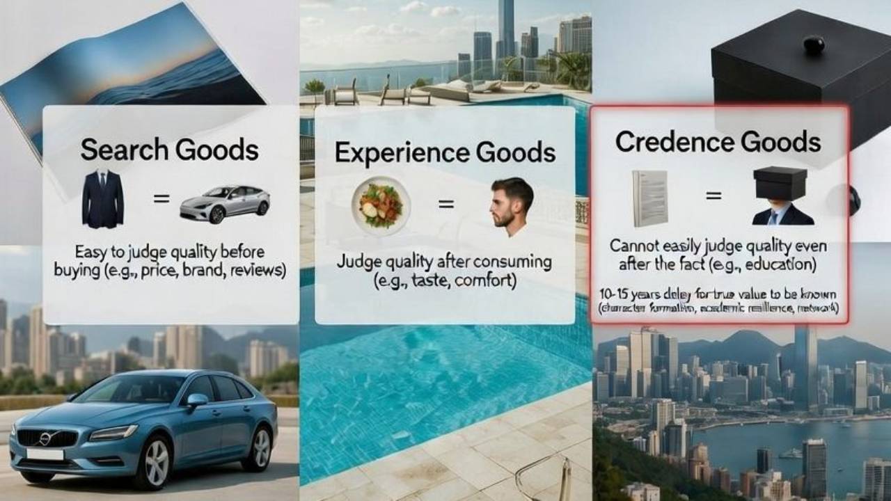 Because parents cannot verify the quality of the education directly (the "Credence" problem), they subconsciously look for shortcuts. In economics, these are called Signals.